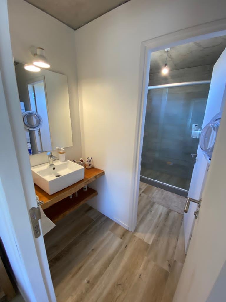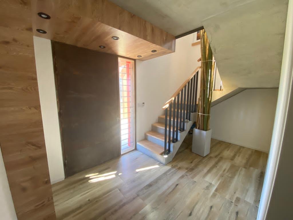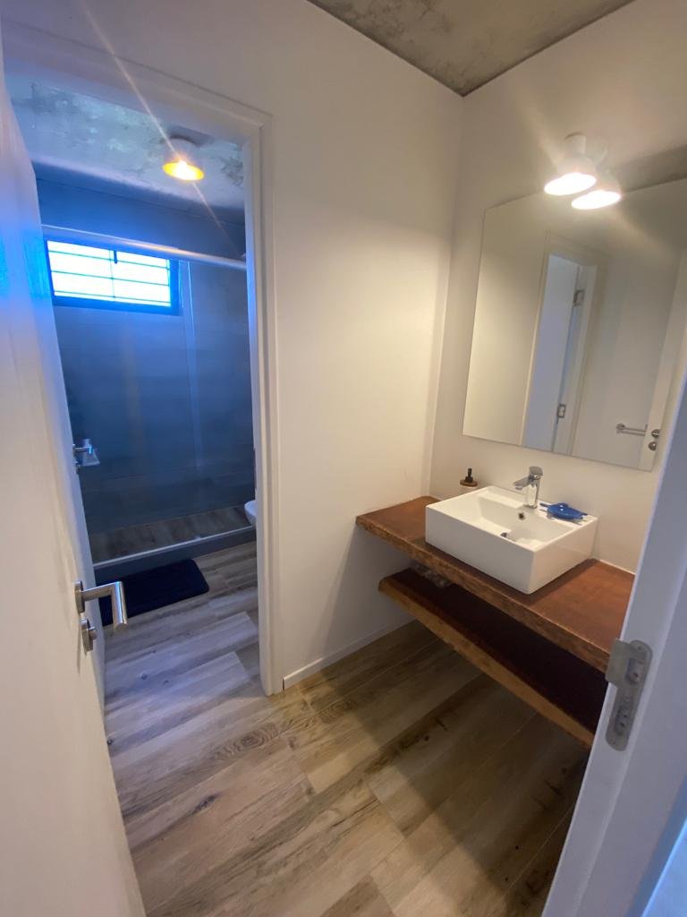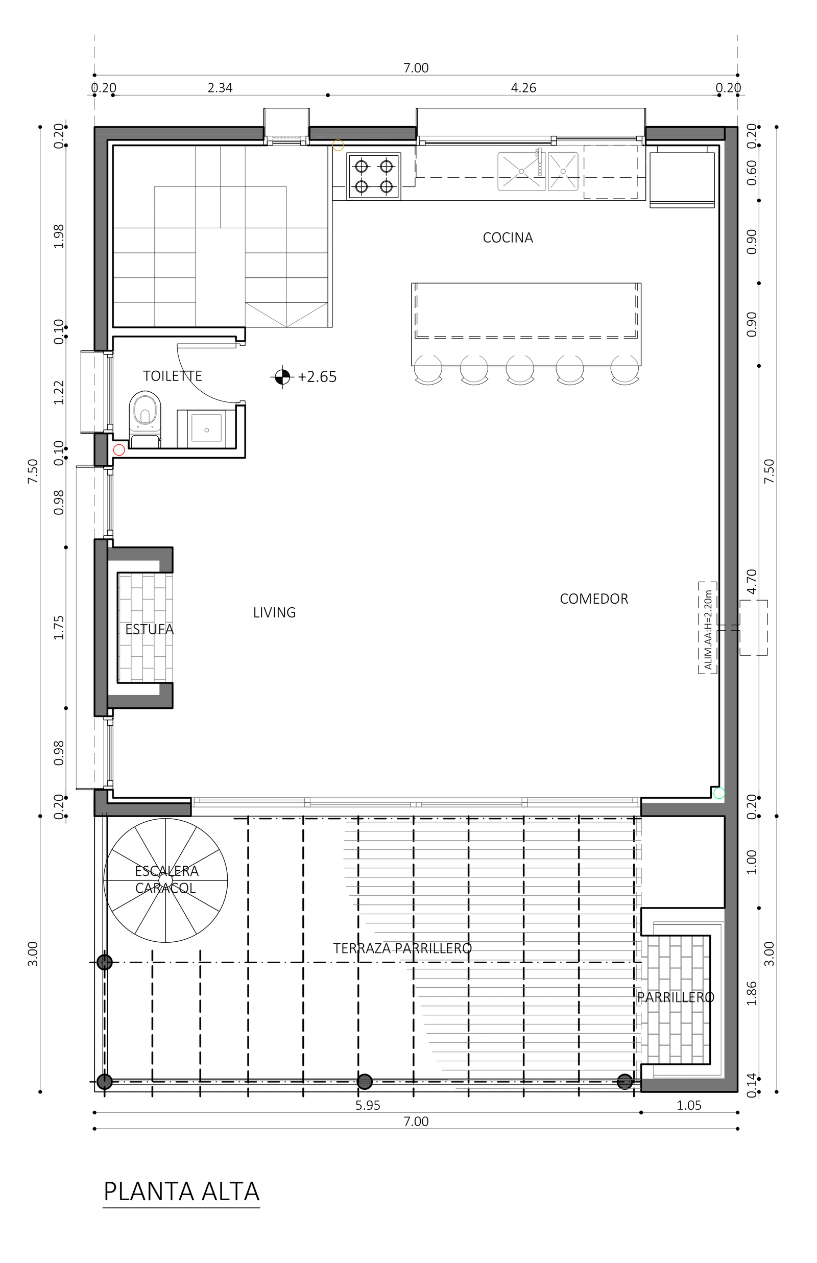 Planta alta desarrollada en un solo ambiente integrando cocina americana con isla para 8 personas, comedor, living con estufa a leña y un baño social.