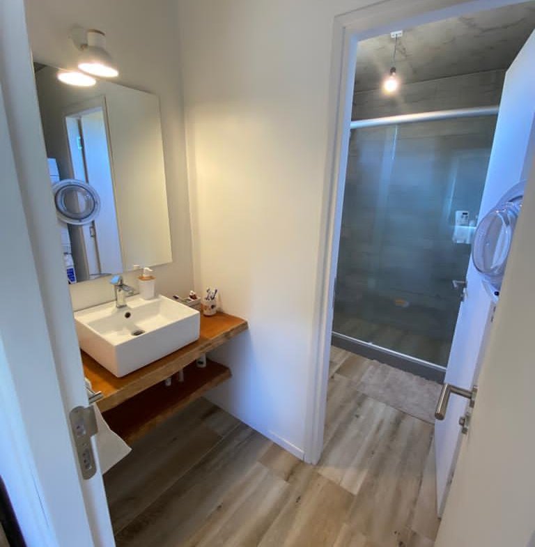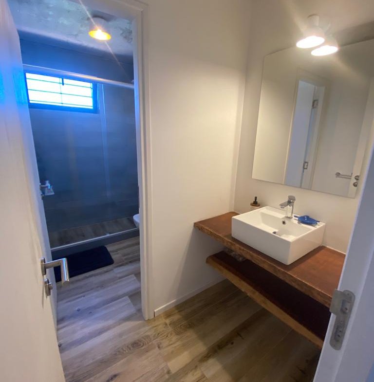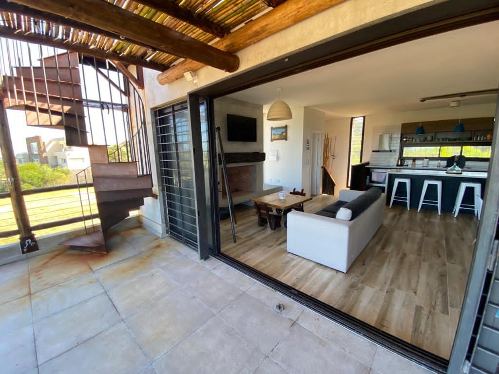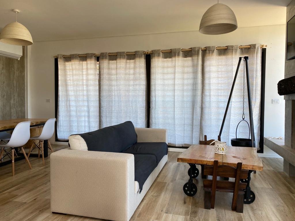 Cocina abierta con isla, Living/comedor, baño, estufa a leña, terraza con parrillero, pérgola y toldos.