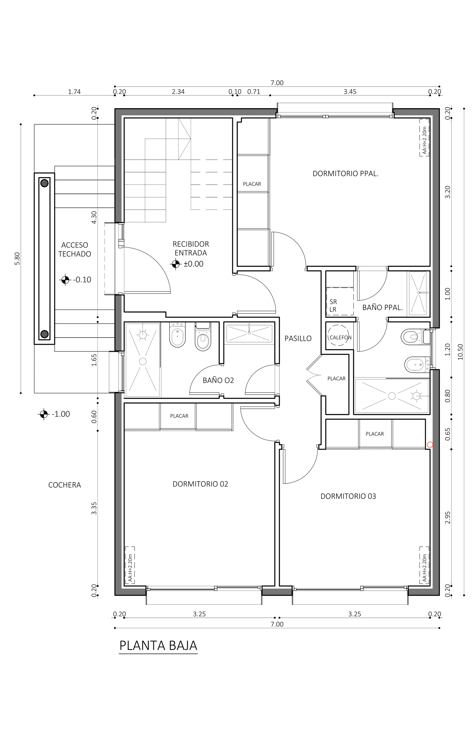 Planta baja con 3 dormitorios (el dormitorio principal con baño en suite y amplio vestidor), 2 baños y lavadero.
